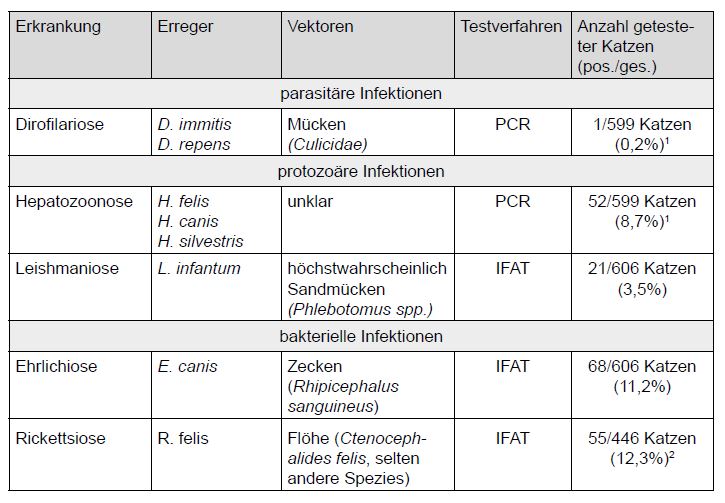 | Erkrankung | Erreger | Vektoren | Testverfahren | Anzahl geteste- ter Katzen (pos./ges.) |