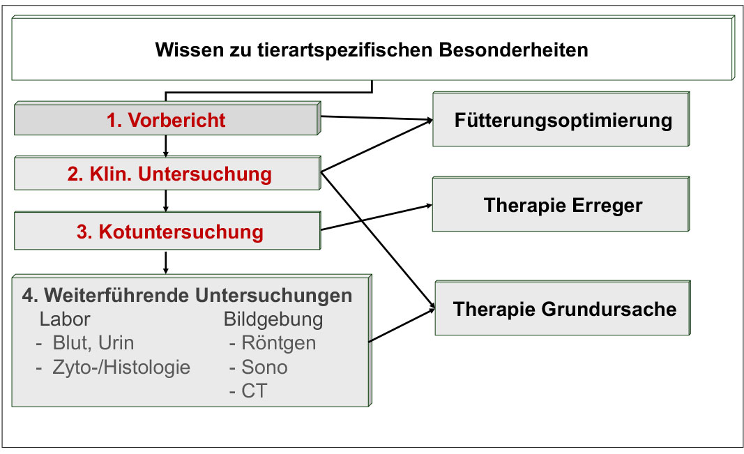 Kleinsäuger haben gern mehrere Probleme und eine alleinige Kotuntersuchung ist selten ausreichend zur erfolgreichen Therapie. Die Aufarbeitung folgt, unabhängig von der Tierart, idealerweise einem bestimmten Schema (Abb. 2). Vorbericht (seit wann, intermittierend/kontinuierlich, mögliche Ursachen (Fütterung, Stressoren, andere Probleme etc.)) und gründliche klinische Allgemeinuntersuchung liefern oft schon wichtige Hinweise auf mögliche Ursachen. Weiterführende Untersuchungen und Therapie erfolgen je nach erhobenen Befunden.