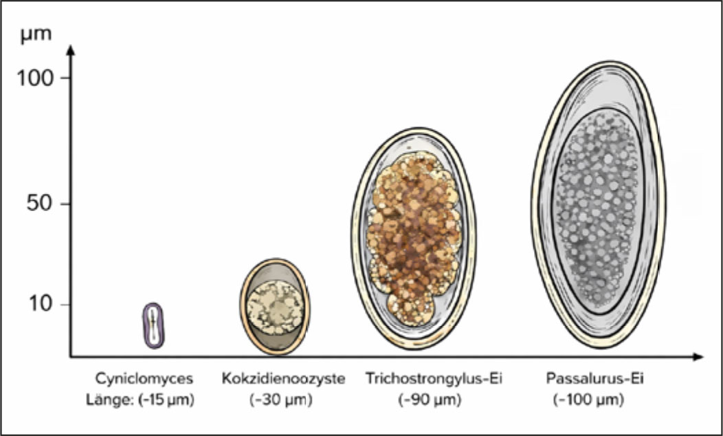 Die einfachste Art mikroskopische Kotpräparate, gerade von Kaninchen, schnell durchzuscannen, ist zunächst in der 1:100 Vergrößerung (10er Objektiv) die Ebenen einzustellen, in der die Hefen gut zu sehen sind. Hefen sind ca. 10–15 µm groß und somit die kleinsten interessanten Stadien bei der Kotuntersuchung. Kokzidienoozyten (ca. 30 µm) und v. a. Nematodeneier (ca. 100 µm) sind deutlich größer und so einfacher zu finden (Abb. 3).
