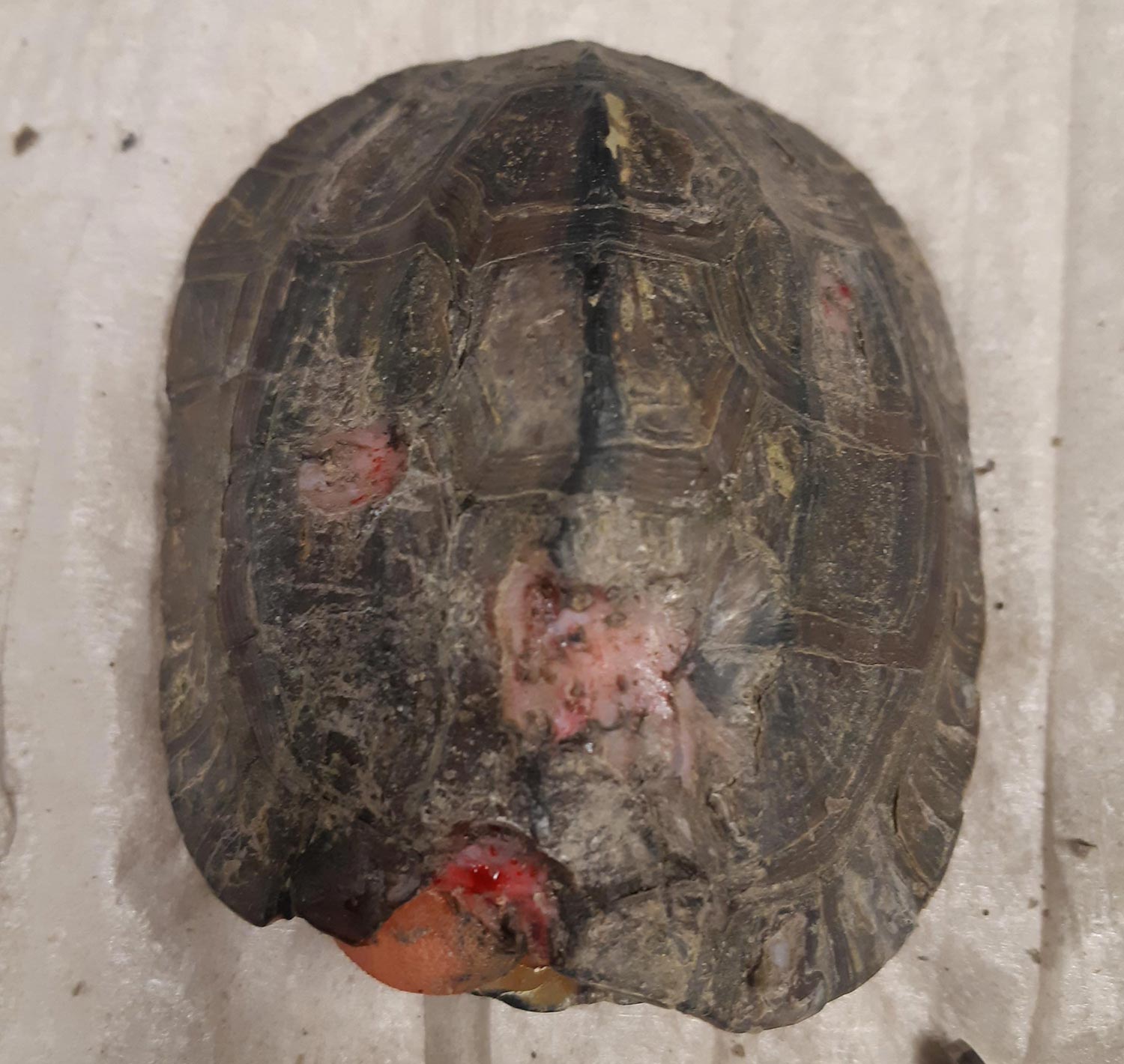 Abb. 2: Panzerläsionen durch Emydomyces testavorans bei einer Wasserschildkröte