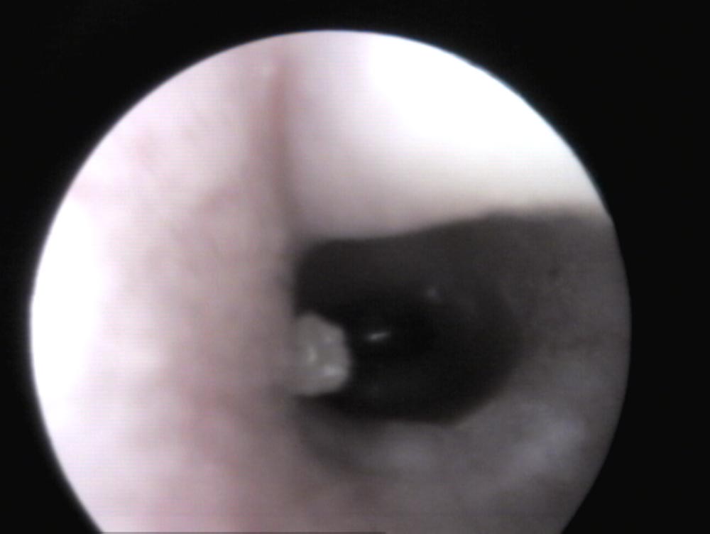 Der äußere Gehörgang wird mittels Otoskop/Videoendoskop untersucht. Bei einem gesunden Ohr kann man, durch leichten Zug der Pinna nach oben (Abb. 1), in der Regel bis zum Trommelfell sehen (Abb. 3). Ist Material im Ohrkanal vorhanden, gilt es zu unterscheiden, ob es „nur“ gestautes Zerumen (weiß in Tiefe, gelblich zur Öffnung hin) und der Gehörgang sonst reizlos ist, oder ob Entzündungszeichen (Rötung, Schwellung, Läsionen, Verflüssigung des Sekrets) (Abb. 4) und mögliche Primärursachen wie Fremdkörper und/oder Ektoparasiten vorhanden sind. Bei der Unterscheidung hilft die Zytologie.
