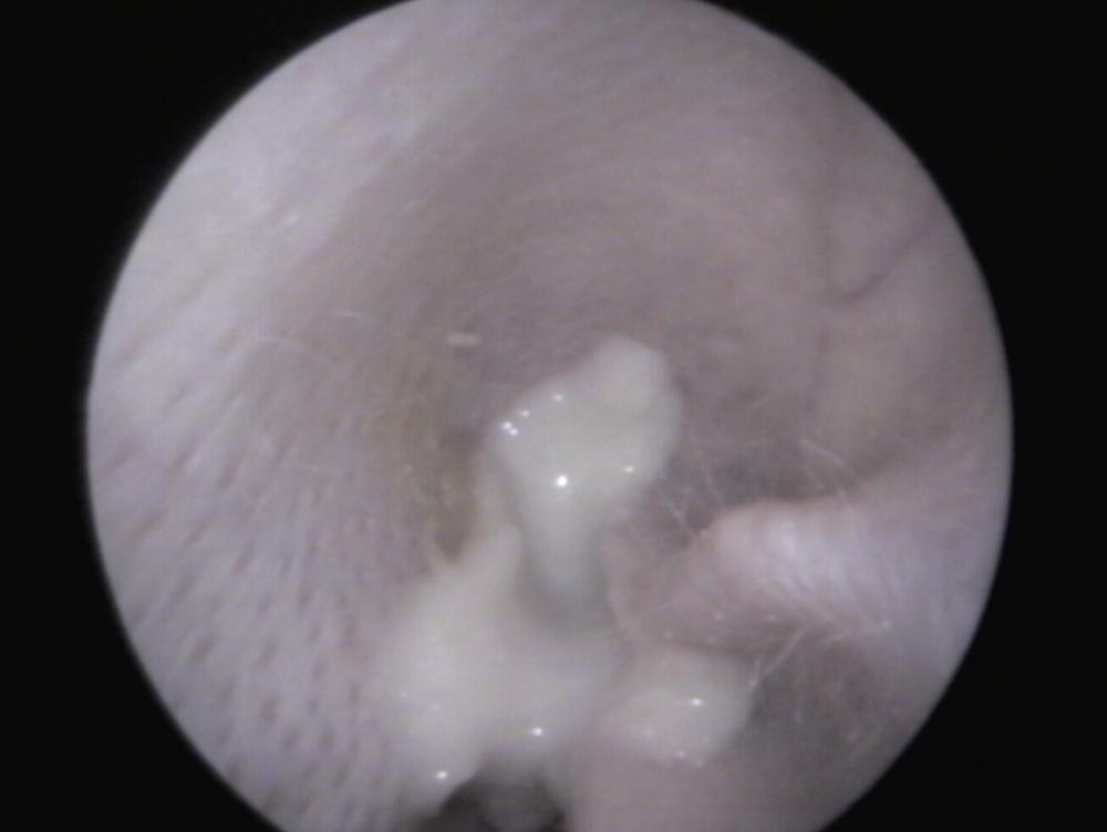 Abb. 4: Blick in ein mit Eiter gefülltes Außenohr eines Kaninchens – das sonst reizlose Außenohr spricht für die Herkunft des Eiters aus dem Mittelohr