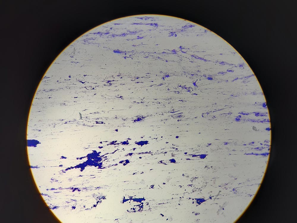 Abb. 8: Mikroskopisches Bild eines Ohrabstrichs eines Kaninchens mit Hefen-Otitis mit zahlreichen, tiefblau gefärbten, runden Malassezia cuniculi. Das Zerumen nimmt kaum Farbstoff an (Vergr. 100fach, Diff-Quick®)