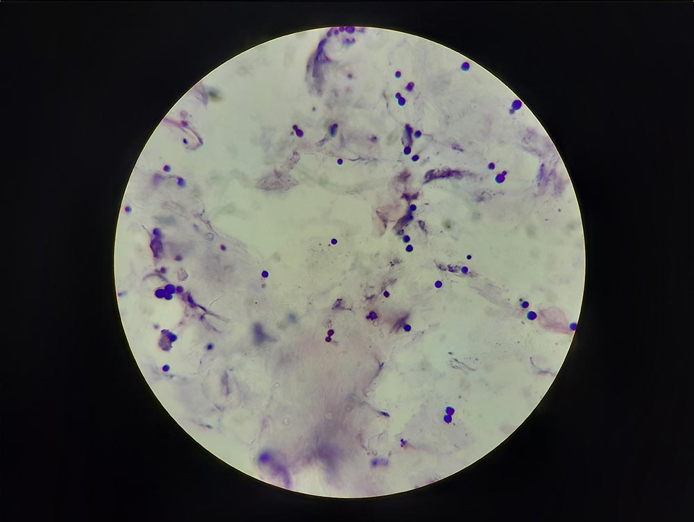 Malassezien (Malassezia cuniculi) sind bei Kaninchen rund, unterschiedlich groß, teilweise in Sprossung und tief blau gefärbt (Abb. 8).